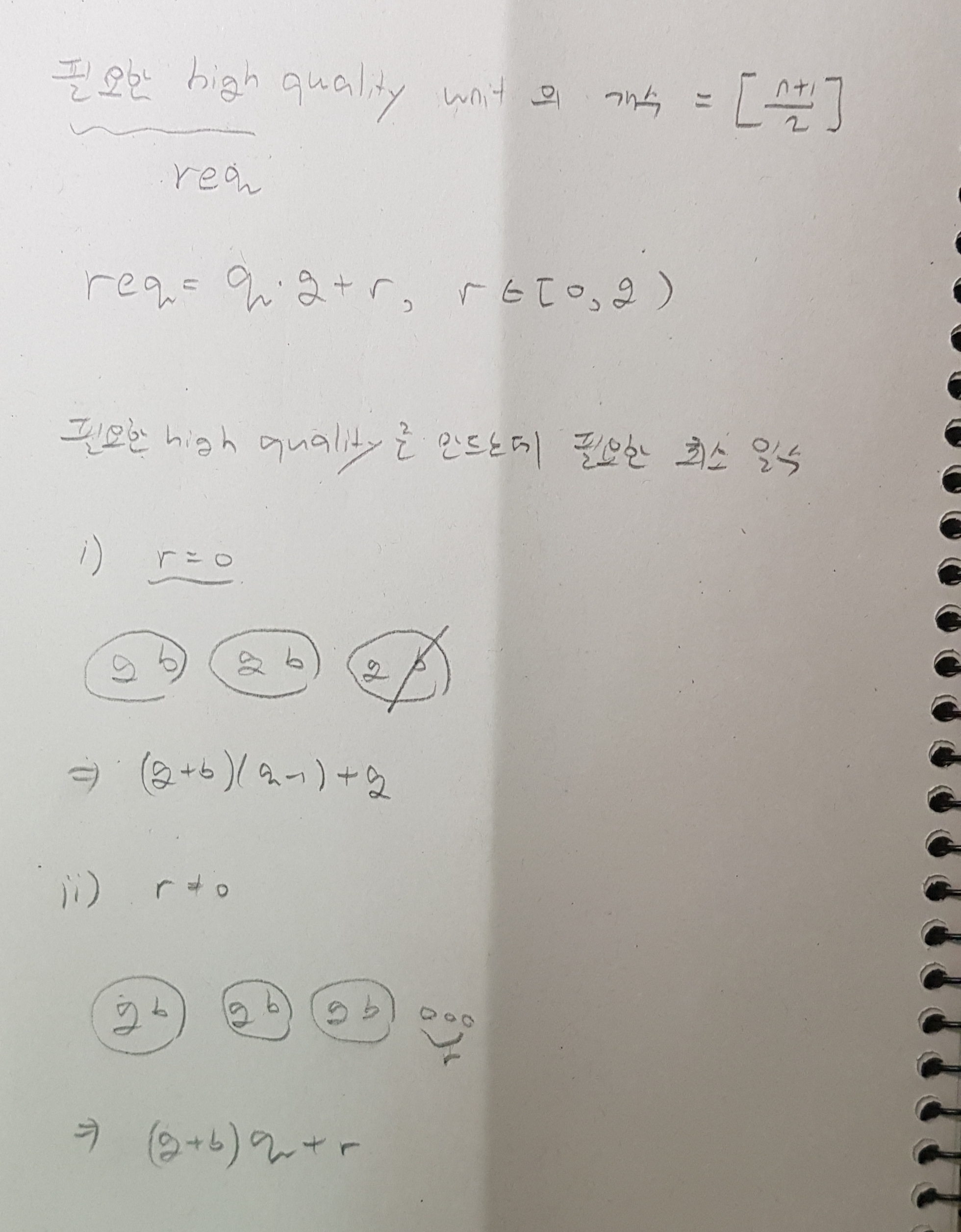 1234567891011121314151617181920212223242526272829303132#include <bits/stdc++.h>#define endl "\n"#define ooop(i, n) for(int i = 0; i < n; i++)#define loop(i, n) for(int i = 1; i <= n; i++)#define all(v) (v).begin(), (v).end()using namespace std;typedef long long ll;typedef pair<int, int> pi;typedef pair<ll, ll> pl;int main(){ios::sync_with_stdio(false);cin.tie(0), cout.tie(0);int t;cin >> t;while(t--){ll n, g, b;cin >> n >> g >> b;ll req = (n+1)/2;ll q = req/g;ll r = req%g;ll nes = 0;if(r == 0) nes = (g+b)*(q-1)+g;else nes = (g+b)*q+r;cout << ((nes < n)? n: nes) << endl;}return 0;}cs'코드포스' 카테고리의 다른 글