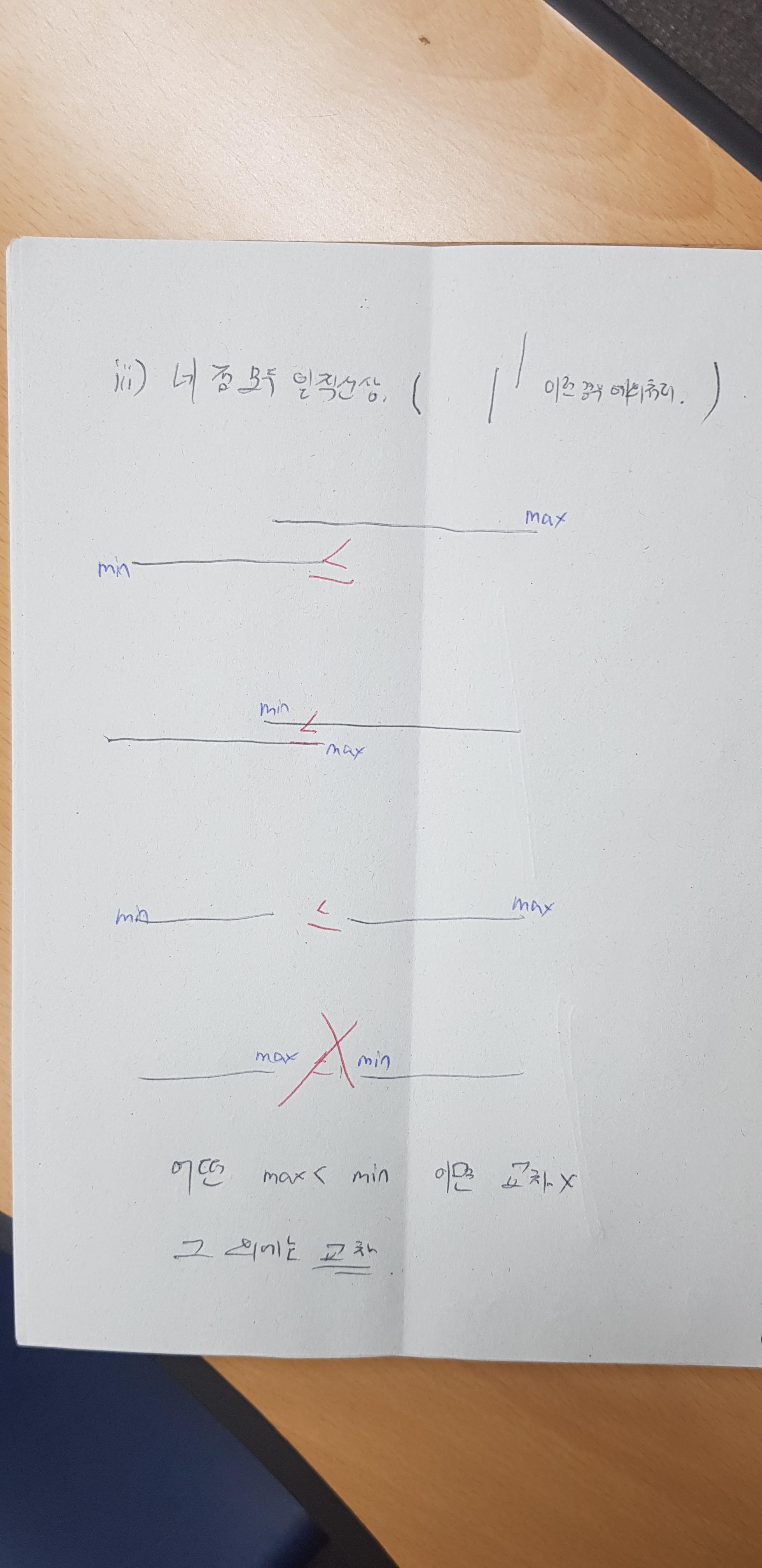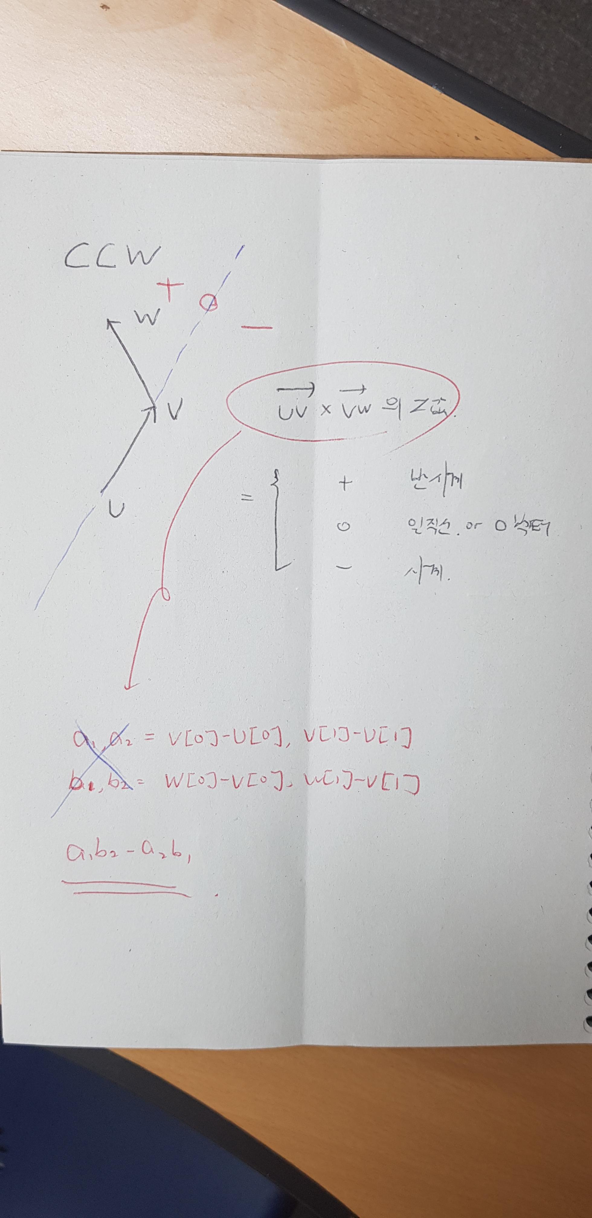 123456789101112131415161718192021def ccw(u, v, w):a1, a2 = v[0] - u[0], v[1] - u[1]b1, b2 = w[0] - v[0], w[1] - v[1]return a1*b2 - a2*b1x1, y1, x2, y2 = map(int, input().split())x3, y3, x4, y4 = map(int, input().split())d1 = (x1, y1)d2 = (x2, y2)d3 = (x3, y3)d4 = (x4, y4)cri1 = ccw(d1, d2, d3)*ccw(d1, d2, d4)cri2 = ccw(d3, d4, d1)*ccw(d3, d4, d2)if ccw(d1, d2, d3) == 0 and ccw(d1, d2, d4) == 0:c1 = max(d1[0], d2[0]) < min(d3[0], d4[0])c2 = max(d3[0], d4[0]) < min(d1[0], d2[0])c3 = max(d1[1], d2[1]) < min(d3[1], d4[1])c4 = max(d3[1], d4[1]) < min(d1[1], d2[1])print(0 if c1 or c2 or c3 or c4 else 1)'아무거나적어~' 카테고리의 다른 글