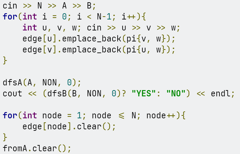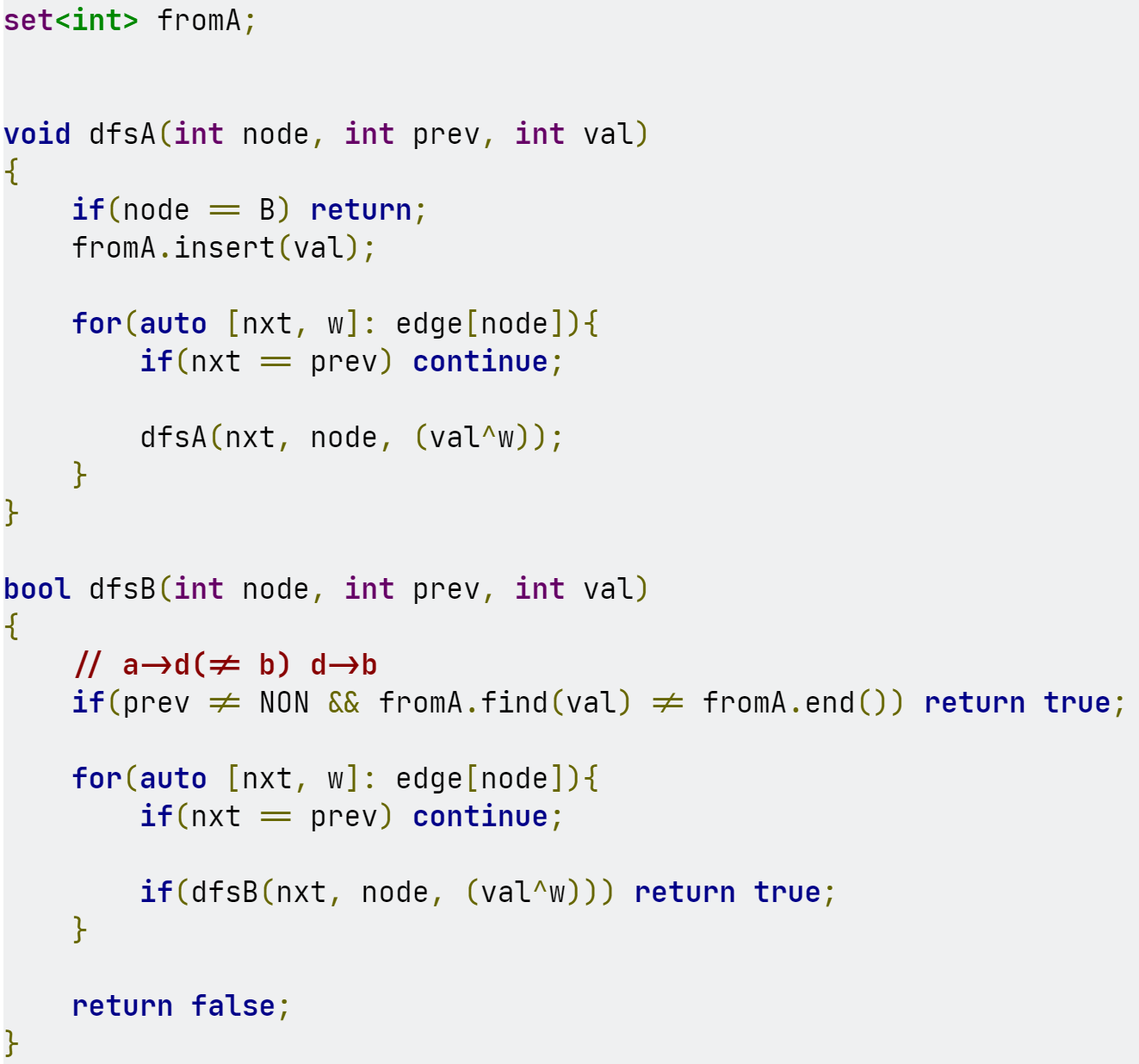 a에서 출발하여 인접한 노드로 움직일 때 각 노드에서의 x의 값은 유일하게 결정된다(∵ xor의 항등원이 0). 따라서 각 노드에서의 x 값은 a와 그 노드의 단순 경로의 weight 들로 계산할 수 있다.