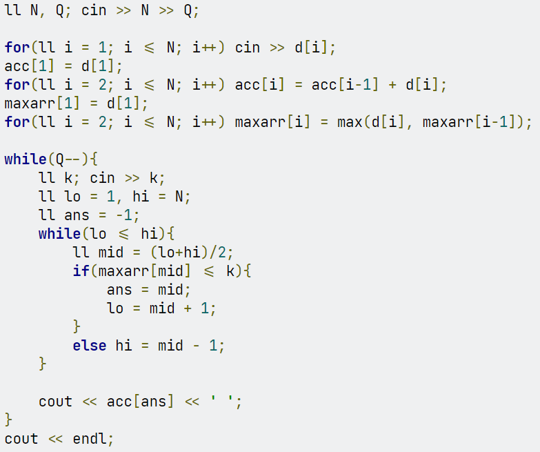 ci = max(a1, a2, ... , ai)다리길이가 ci 이상이라면 적어도 높이 bi만큼은 올라 갈 수 있다. 하지만 다리 길이가 ci 미만이면 높이 bi만큼 올라가지 못한다. 따라서 다리길이가 k이면 올라갈 수 있는 최대 높이를 구하려면 k이하인 cj 중 가장 오른쪽에 있는 cj의 index인 j를 찾으면 된다. 답은 bj