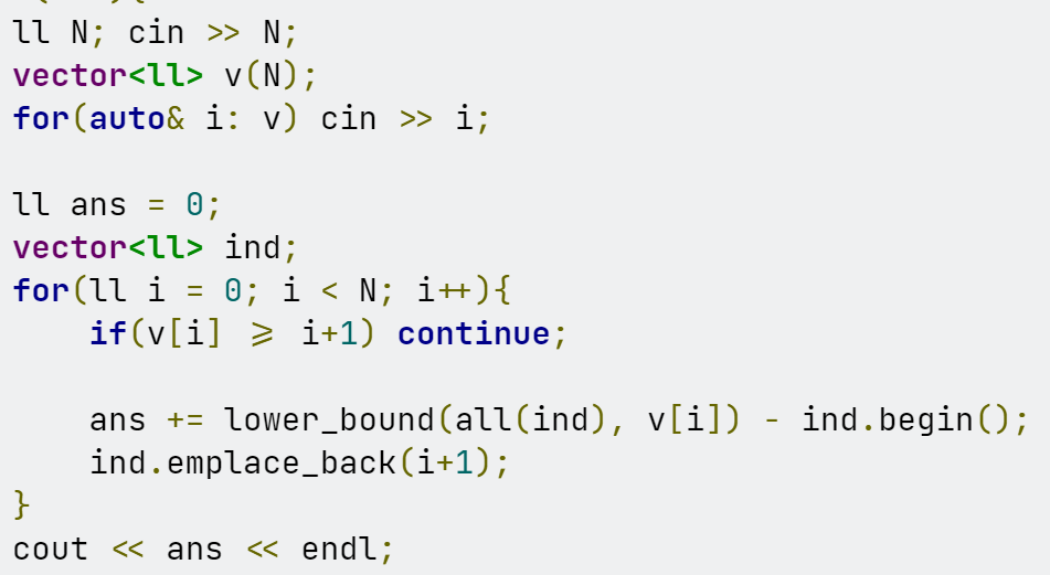 ai < i 를 만족하는 원소에 대하여, i < j && i < aj 인 (i, j)의 개수를 세자.