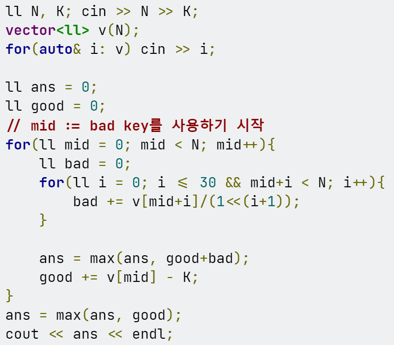(만약 앞서 bad key를 사용한 적이 있다면 case1, 2 논리에서 얻을 수 있는 코인의 양은 모두 1/2로 줄어들지만 대소관계예 영향을 미치지는 않는다). 따라서 수학적 귀납법에 의해 good key만을 사용하다가 bad key 만을 사용하는 것이 최적이다.이제 최적의 방법으로 brute force를 시행한다. 이때 10^9//2^30 이므로 bad key 사용 이후 30번째 뒤 chests에서 얻을 수 있는 코인은 0이 된다. 이를 이용하여 brute force를 최적화하자.