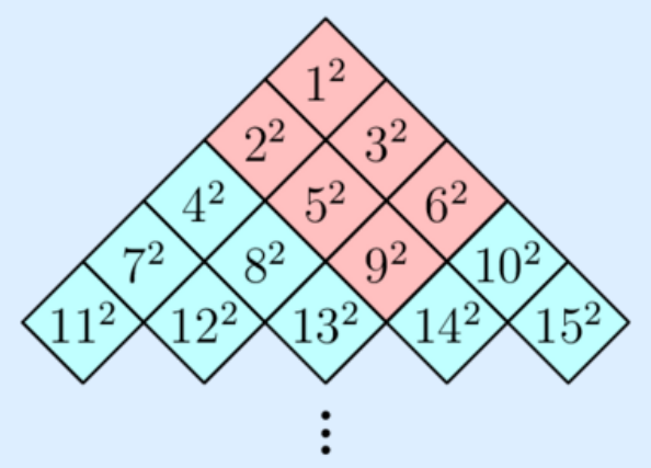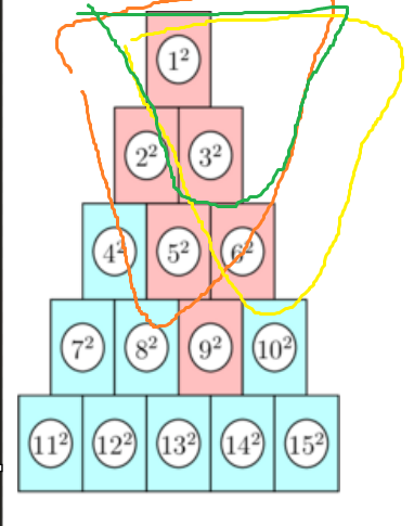 dp[r][c] := i² + dp[r-1][c-1] + dp[r-1][c] - dp[r-2][c-1]ex) dp[9] = 9² + dp[5] + dp[6] - dp[3]
