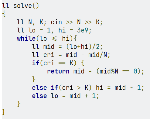 자연수 1부터 N개씩 하나의 블럭으로 생각하자. 그러면 하나의 블럭에는 N으로 나누어떨어지지 않는 수가 (N-1)개 존재한다.따라서 K개의 나누어떨어지지 않는 수를 위해서는 적어도 K/(N-1)개의 블럭이 필요하다.