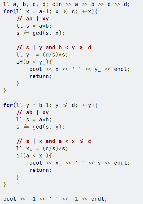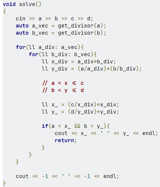 1 ≤ b < y ≤ d ≤ 10⁵10⁵ 이하의 자연수는 1초안에 충분히 순회할 수 있으므로(대략 1초에 10⁷ 연산) x를 brute force로 돌리고 y를 O(1) 만에 찾아도 된다.