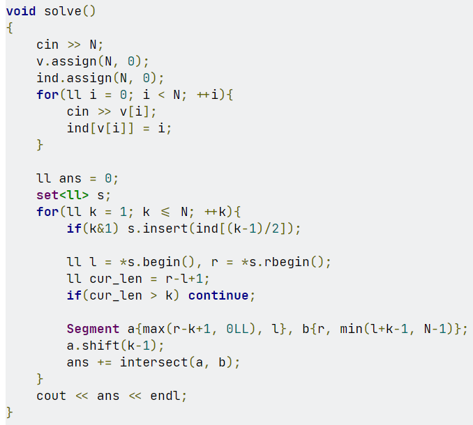 길이가 k인 sebsegment에서 mex > med 이다 iff segment가 0, 1, ... [(k-1)/2]을 포함한다.예를 들어 다음 배열에서 문제를 해결해보자. subsegment의 길이로 경우를 나누어 구한다.