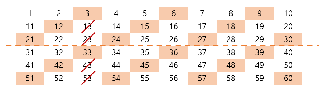 살구색 음영은 3의 배수인 수들이고 빨간색 빗금은 3의 배수가 아닌 수 중 일의자리수가 3인 수이다