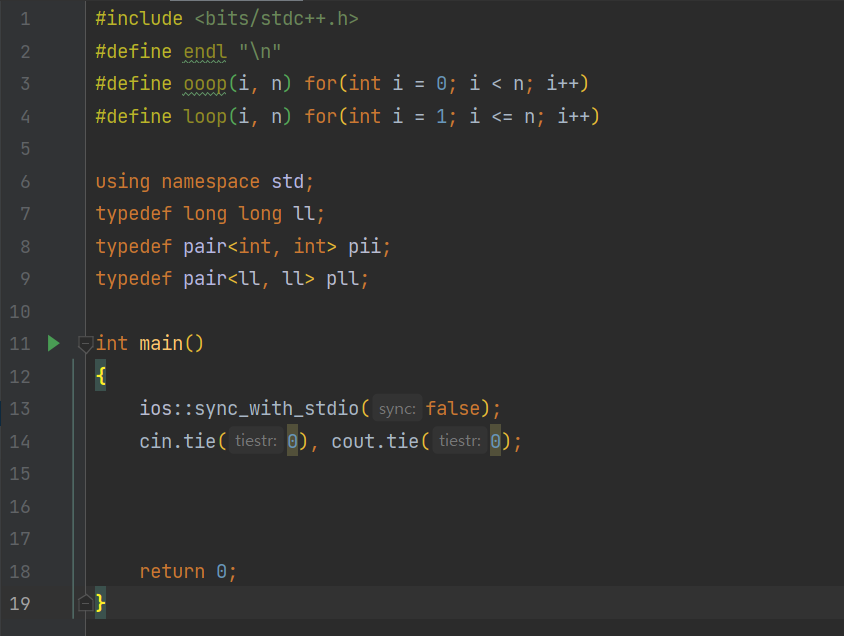 1234567891011121314151617181920#include <bits/stdc++.h>#define endl "\n" // don't use when you cover interactive problem#define ooop(i, n) for(int i = 0; i < n; i++)#define loop(i, n) for(int i = 1; i <= n; i++)#define all(v) (v).begin(), (v).end()using namespace std;typedef long long ll;typedef pair<int, int> pi;typedef pair<ll, ll> pl;int main(){ios::sync_with_stdio(false);cin.tie(0), cout.tie(0);return 0;}cs사용방법